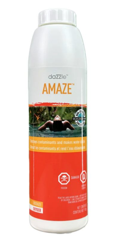 Amaze is a sanitizer-free shock. Use weekly and after heavy use to ensure crystal clear water.